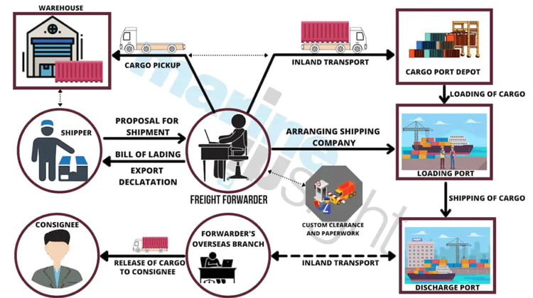 Ví dụ: Một công ty A ở TP. HCM muốn nhập khẩu một lô hàng điện tử từ Incheon, Hàn Quốc. Forwarder sẽ thu xếp ký hợp đồng vận tải nhận chuyển lô hàng này với công ty A. Sau đó, Forwarder sẽ tìm hãng tàu nào phù hợp (chẳng hạn ONE Shipping) để thuê vận chuyển container này từ Hàn Quốc về Việt Nam.